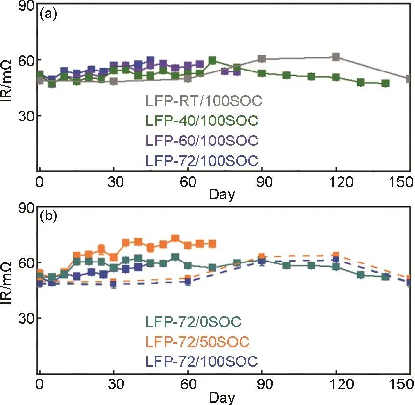內(nèi)阻是鋰離子電池內(nèi)部鋰離子遷移動力學過程阻力的直觀體現(xiàn),也是反映鋰離子電池性能變化的重要參量之一。在本研究中,雖然經(jīng)過儲存后磷酸鐵鋰電池的容量出現(xiàn)了明顯的衰退,但該型電池在50% SOC時的4C脈沖內(nèi)阻卻較為穩(wěn)定。如圖2所示,在整個實驗周期內(nèi),大部分LFP電池內(nèi)阻呈現(xiàn)輕微波動增加的趨勢,僅LFP-72/50SOC電池樣品內(nèi)阻出現(xiàn)明顯增加。