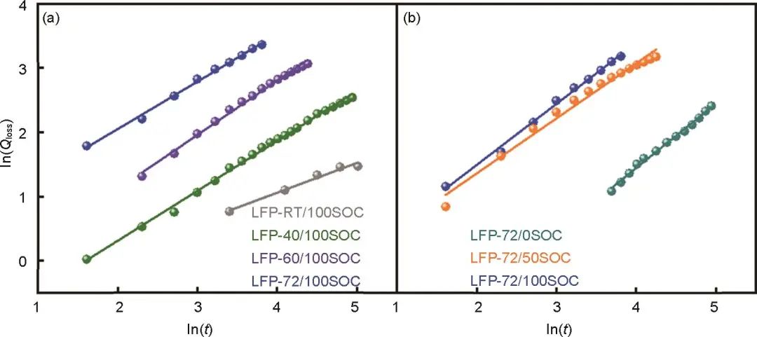 圖3 不同存儲條件下LFP電池容量損失 (Qloss) 與存儲時間 (t) 之間的對數(shù)擬合關(guān)系