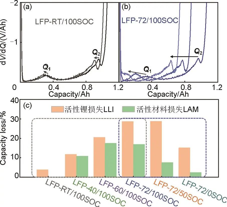 圖4 (a) LFP-RT/100SOC和 (b) LFP-72/100SOC電池樣品的電壓微分曲線;(c) 不同樣品容量損失因素比較