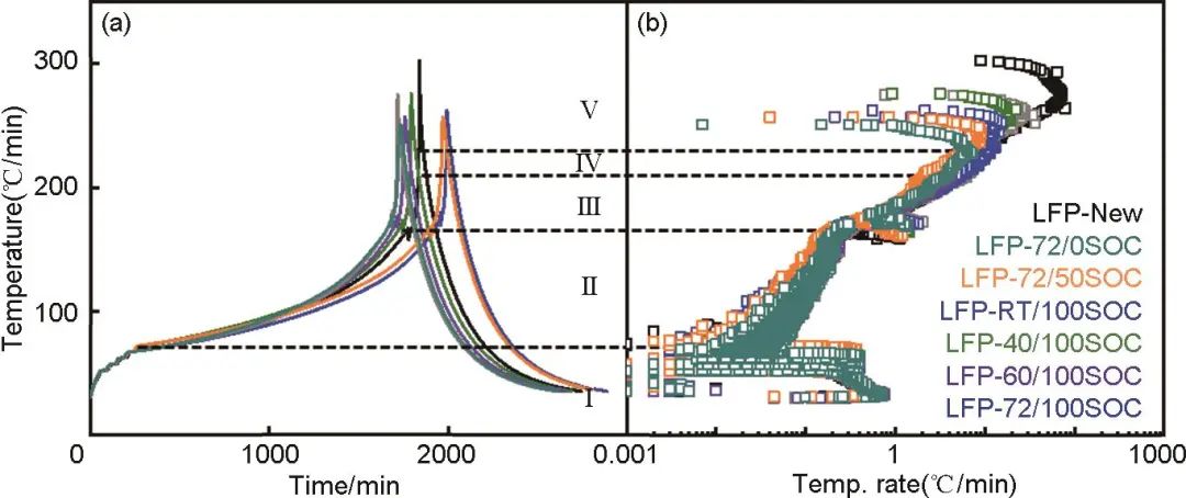 進一步對磷酸鐵鋰電池單體的熱安全性進行了研究,在絕熱環(huán)境中通過設備加熱來引發(fā)電池自發(fā)熱并最終觸發(fā)電池熱失控。結(jié)果如圖5所示,新鮮電池樣品LFP-New的熱失控反應表現(xiàn)最為劇烈,其熱失控最高溫度TMAX最大,達302.6 ℃,熱失控最大溫升速率(dT/dt)MAX最高,達79 ℃/min;然而,經(jīng)過不同條件存儲之后,該型磷酸鐵鋰電池的熱安全性均有不同程度的提升,體現(xiàn)在其主要熱失控特性參數(shù)TMAX和(dT/dt)MAX均有所下降。圖5(b)顯示磷酸鐵鋰電池熱失控溫升速率過程表現(xiàn)出明顯的分階段特征,本工作中將電池熱失控劃分為5個階段,其中:階段I為“加熱-等待-搜尋”階段,此過程中儀器腔內(nèi)溫度呈階梯式上升,為電池提供熱量;階段II為電池自加熱階段(自加熱至泄壓閥打開);階段III為電池快速自加熱階段;階段IV為電池熱失控階段;階段V為熱失控結(jié)束降溫階段。