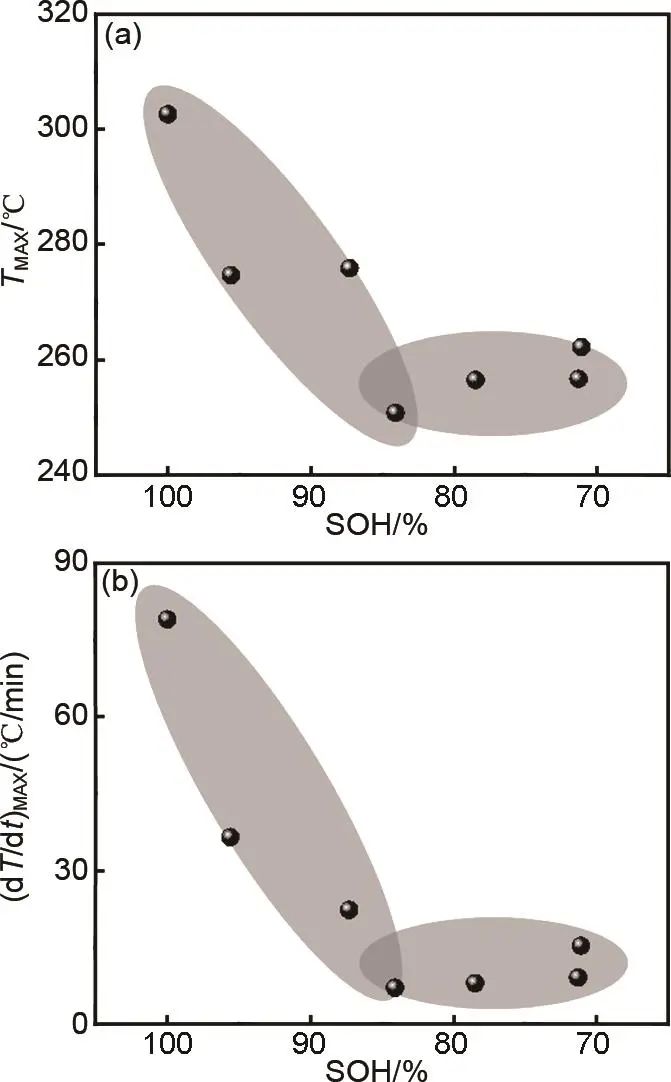 圖6 LFP電池SOH與熱失控 (a) 最高溫度和 (b) 最大溫升速率之間的關(guān)系