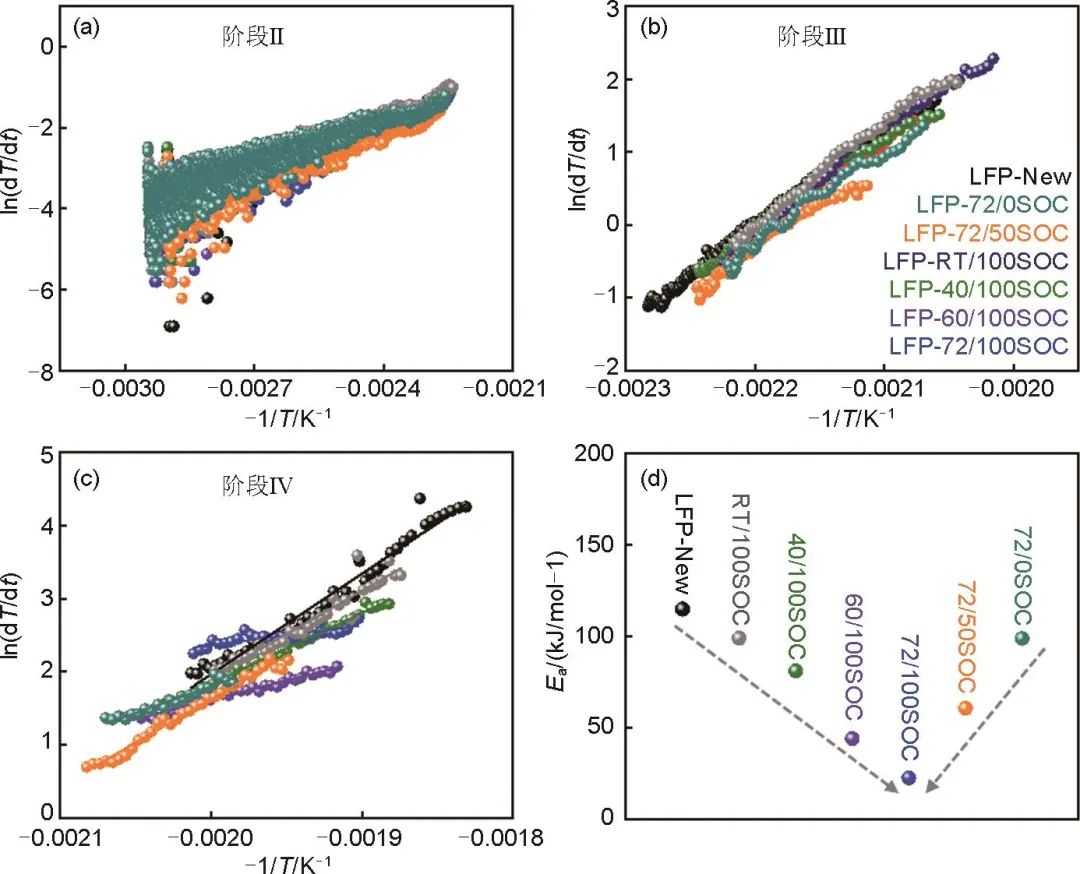 電池自加熱(階段II和階段III)和熱失控(階段IV)等階段是研究電池熱失控反應動力學過程的重要對象。不同磷酸鐵鋰電池樣品自加熱過程(階段II和階段III),即熱失控孕育過程的動力學行為較為相似,其中階段II自加熱過程表觀活化能為30 kJ/mol左右[圖7(a)],階段III自加熱過程表觀活化能為110 kJ/mol左右[圖7(b)]。然而經(jīng)歷不同存儲條件后的電池在階段IV的熱失控動力學行為則表現(xiàn)出明顯的存儲老化路徑依賴性[圖7(c)]。圖7(d)結(jié)果直觀地展示了熱失控過程表觀活化能受外界條件的影響。隨著環(huán)境溫度或荷電狀態(tài)的上升,熱失控表觀活化能EaIV逐漸下降,從最高114.9 kJ/mol顯著降至22.4 kJ/mol,72 ℃高溫存儲電池LFP-72/100SOC的EaIV僅為新鮮電池LFP-New的1/5左右。綜上,雖然存儲老化程度越高的磷酸鐵鋰電池整體熱安全風險更低[TMAX和(dT/dt)MAX較低],但是其熱失控反應過程(階段IV)由于表觀活化能較低也更容易被觸發(fā),因此需綜合表征和評價不同存儲歷史或不同生命周期階段磷酸鐵鋰電池的熱安全性。