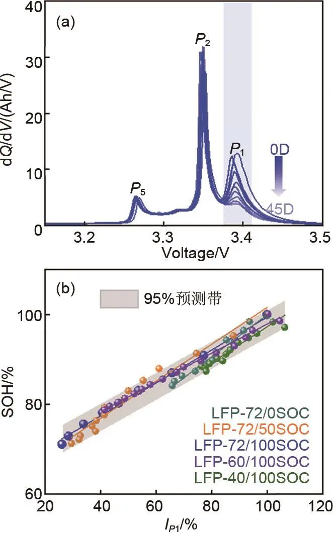 圖8 (a) LFP-72/100SOC樣品的容量增量曲線;(b) LFP電池健康狀態(tài)SOH與特征峰強IP1關(guān)系圖
