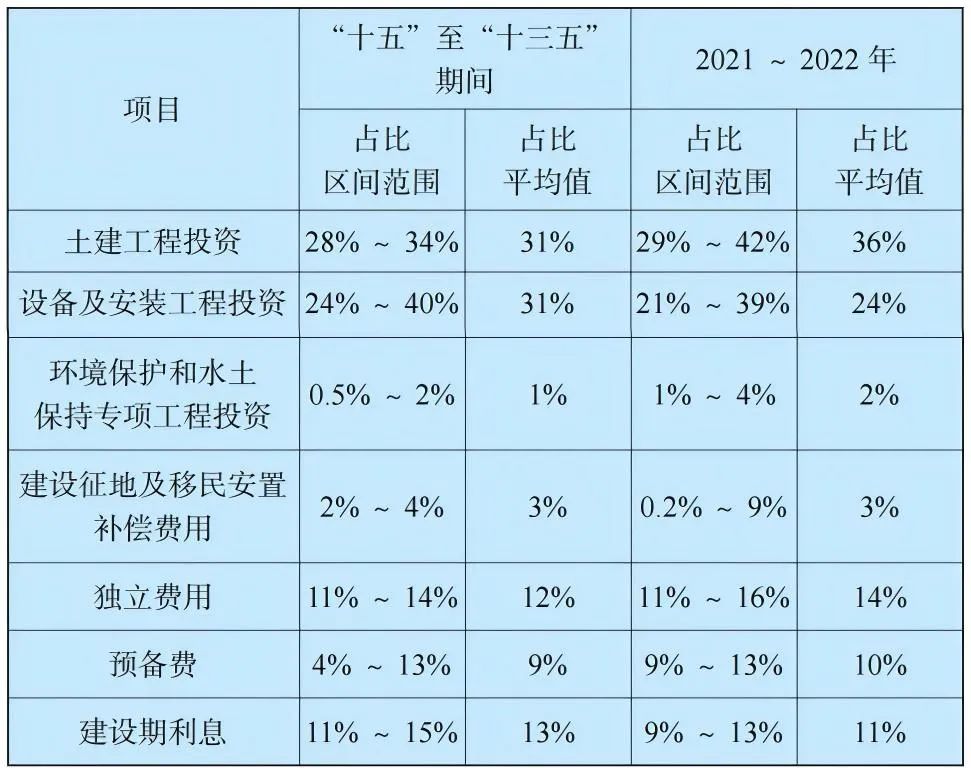 抽水蓄能電站工程總投資由土建工程投資(包括施工輔助工程、建筑工程),設(shè)備及安裝工程投資(包括機電設(shè)備及安裝工程、金屬結(jié)構(gòu)設(shè)備及安裝工程),環(huán)境保護和水土保持專項工程投資,建設(shè)征地及移民安置補償費用,獨立費用,預(yù)備費(包括基本預(yù)備費、價差預(yù)備費),以及建設(shè)期利息等。根據(jù)我國可再生能源定額站對“十五”至“十三五”期間、2021~2022年工程綜合統(tǒng)計數(shù)據(jù),各部分投資占比情況如表1所示[8]。