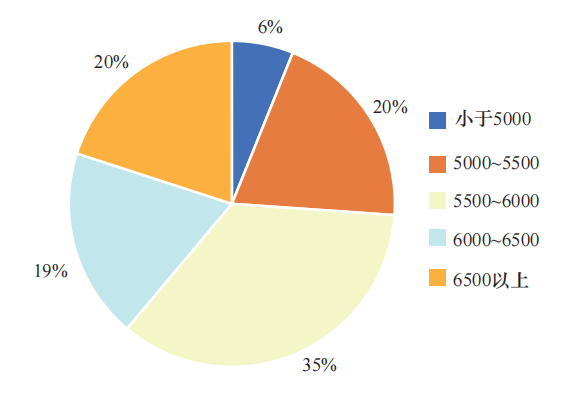 韓冬等對我國抽水蓄能站點資源評價及分布進行了研究,根據(jù)抽水蓄能平均造價對各地級市資源稟賦按5級進行了分級量化,初步表明抽水蓄能電站具備執(zhí)行標桿電價的條件,但是按地級市劃分的資源分區(qū)較復(fù)雜,分區(qū)難連成片,不利于政策執(zhí)行[9]。從鼓勵先進、降低價格管理成本考慮,本文進一步研究了全國劃分3~5個資源區(qū)、每個省盡量一個資源區(qū)的可行性。標桿容量電價的基礎(chǔ)是合理可行的資源分區(qū)。對全國各地區(qū)500多個正在開展前期工作的抽水蓄能電站單位千瓦投資進行統(tǒng)計,單位千瓦投資范圍主要在4800~7000元/kW,不同單位千瓦投資區(qū)間抽水蓄能數(shù)量比例如圖1所示。