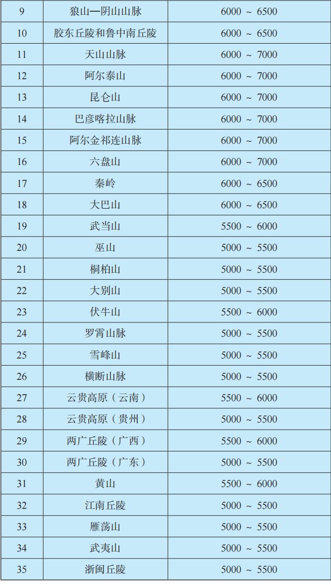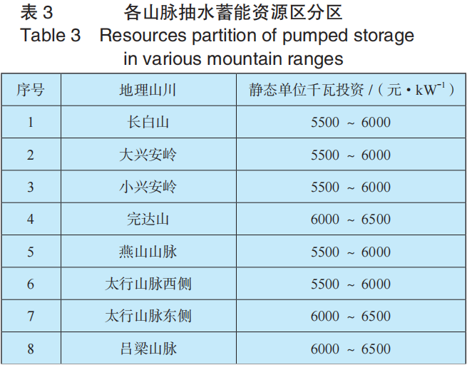 抽水蓄能電站需要地形高差,將各抽水蓄能站點疊在山脈地形圖上,根據(jù)逐個統(tǒng)計比較,各山脈抽水蓄能資源區(qū)分區(qū)內(nèi)[10],詳見表3。