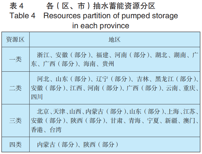 部分?。▍^(qū)、市)需要劃分兩個或者多個資源區(qū)。東北三省境內(nèi)抽水蓄能電站主要集中在長白山脈、大小興安嶺和完達山山脈,長白山脈、大小興安嶺山脈區(qū)域整體建設(shè)條件和二類資源區(qū)域?qū)?yīng);完達山山脈水頭較低,遼西地區(qū)建設(shè)條件較差,從建設(shè)條件和三類區(qū)域相對應(yīng),因此吉林省、黑龍江部分區(qū)域、遼東地區(qū)劃分為二類,其余區(qū)域劃分為了三類。河南各區(qū)域建設(shè)條件有一定差別,從統(tǒng)計結(jié)果來看,信陽市、南陽市建設(shè)條件較好,與一類資源區(qū)相對應(yīng),其余地區(qū)建設(shè)條件和二類資源區(qū)對應(yīng),而河南南部和北部均有布局抽水蓄能電站的必要性。因此根據(jù)統(tǒng)計數(shù)據(jù),河南省部分劃分為一類區(qū)域,部分劃分為二類區(qū)域。行政分區(qū)映射后的結(jié)果見表4。