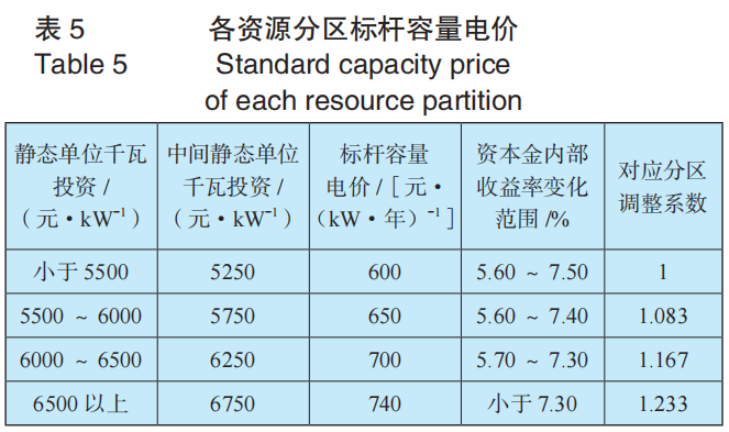 如果全國采用一個標桿容量電價,則可以對各資源分區(qū)設(shè)置調(diào)整系數(shù),調(diào)整系數(shù)見表5。