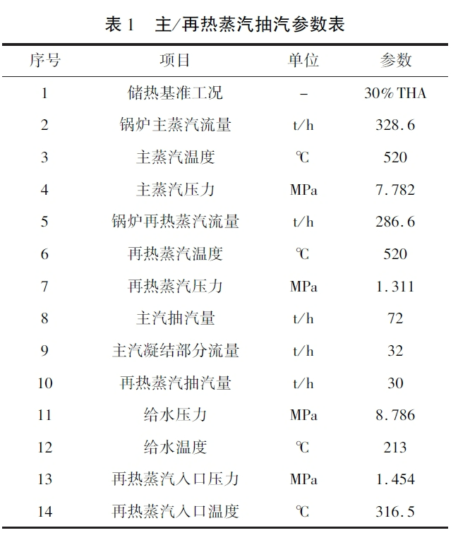本系統方案儲熱基準工況設定為30%THA,根據汽機熱平衡圖,30%THA負荷主汽參數為520℃/7.782MPa,再熱蒸汽參數為520℃/1.454MPa。根據系統方案抽汽蓄能調峰區(qū)間為30%~24.%THA,為滿足調峰要求,同時抽取主、再熱蒸汽,經過核算主汽抽汽量為72t/h,其中32t/h蒸汽用于釋放顯熱和潛熱加熱熔鹽冷凝為水,經過循環(huán)泵加壓與給水參數匹配,剩余40t/h主汽只通過釋放顯熱加熱熔鹽,換熱后的蒸汽參數經過減溫減壓與冷段參數進行匹配。