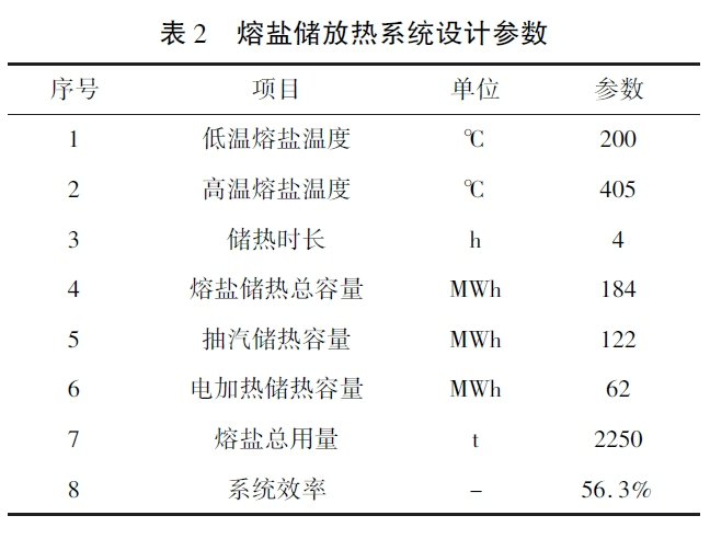 通過系統熱平衡計算,本熔鹽儲熱系統總儲熱容量為184MWh,Hitec三元熔鹽總用量為2250t,其中通過抽汽加熱熔鹽的儲熱容量為122MWh,電加熱熔鹽部分的儲熱容量62MWh。