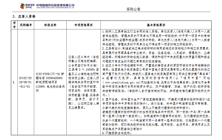要求應(yīng)答人近5年內(nèi)應(yīng)具有2個(gè)100MWh容量及以上儲(chǔ)能電池預(yù)制艙供貨業(yè)績(jī)。