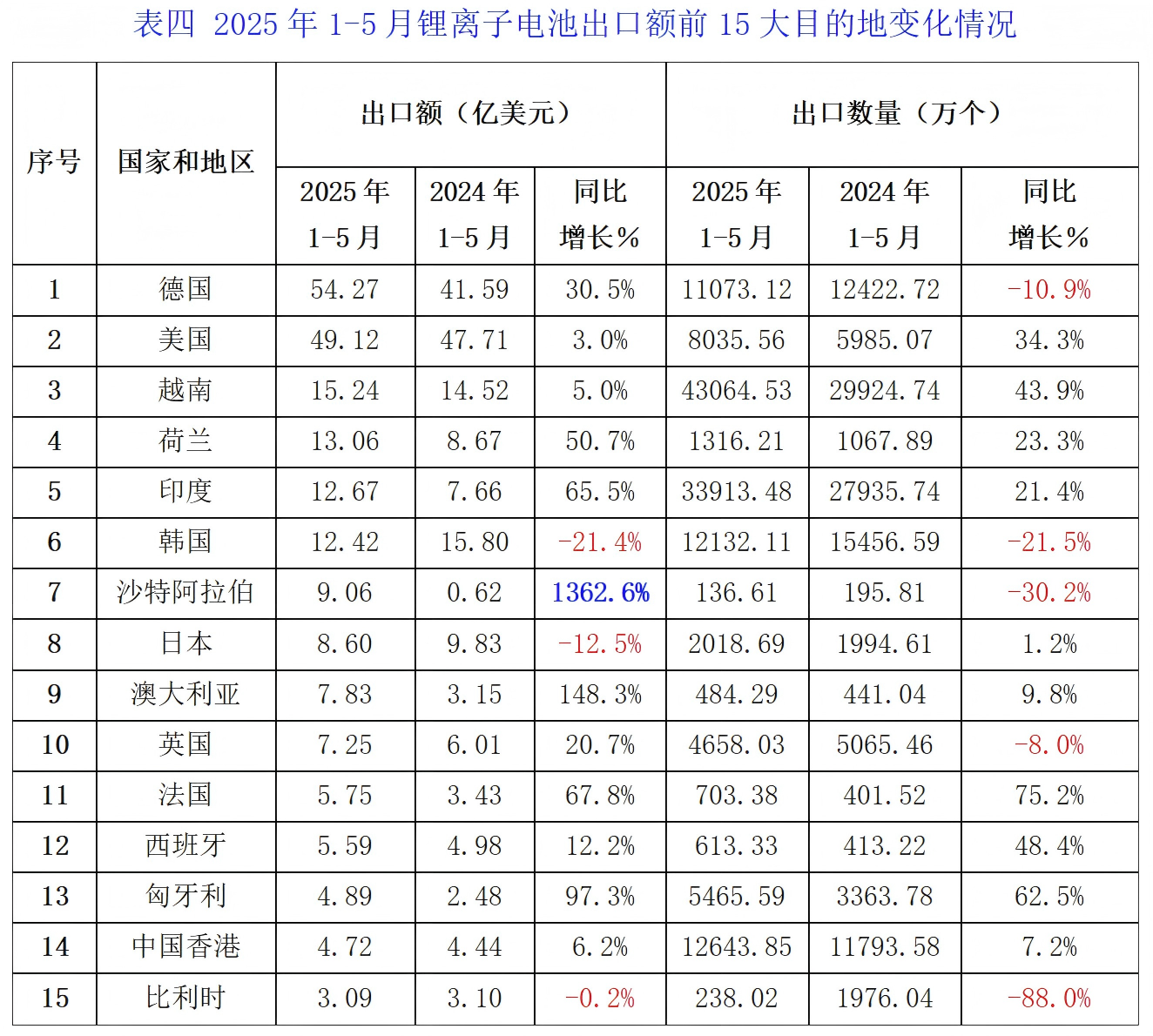 今年以來,德國首次超越美國成為我國鋰離子電池第一大出口市場,2025年1-5月出口金額為54.27億美元,同比增長30.49%,占我國鋰離子出口總額的19.7%。這一變化源于德國車企電動化轉(zhuǎn)型的加速。大眾ID.7、寶馬Neue Klasse等主力電動車型的量產(chǎn),推動了對中國高端動力電池的采購需求。僅2025年第一季度,中國對德動力電池出口就占到整個歐洲市場的52%。