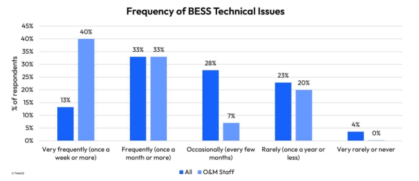 該調(diào)查發(fā)現(xiàn),“73%的運(yùn)維人員每月至少遇到一次技術(shù)問題,而電池儲(chǔ)能系統(tǒng)的資產(chǎn)管理人員只有53%。此外,40%的運(yùn)維人員報(bào)告每周都會(huì)遇到問題,這一比例是資產(chǎn)管理人員的兩倍?!?/strong>