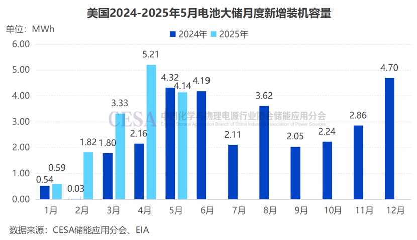CESA儲能應(yīng)用分會基于EIA公示項目分析,美國2025年1-5月共60個大型電池儲能項目相繼投運,新增裝機共4.618GW/15.09GWh,較之去年同期增長43.74%(功率)/70.45%(容量),平均時長3.27小時,較之2024年的2.75小時顯著提升。2025年3月、4月、5月各有一個GWh級儲能項目新投運,4月新增裝機容量更是創(chuàng)新高,超5GWh。