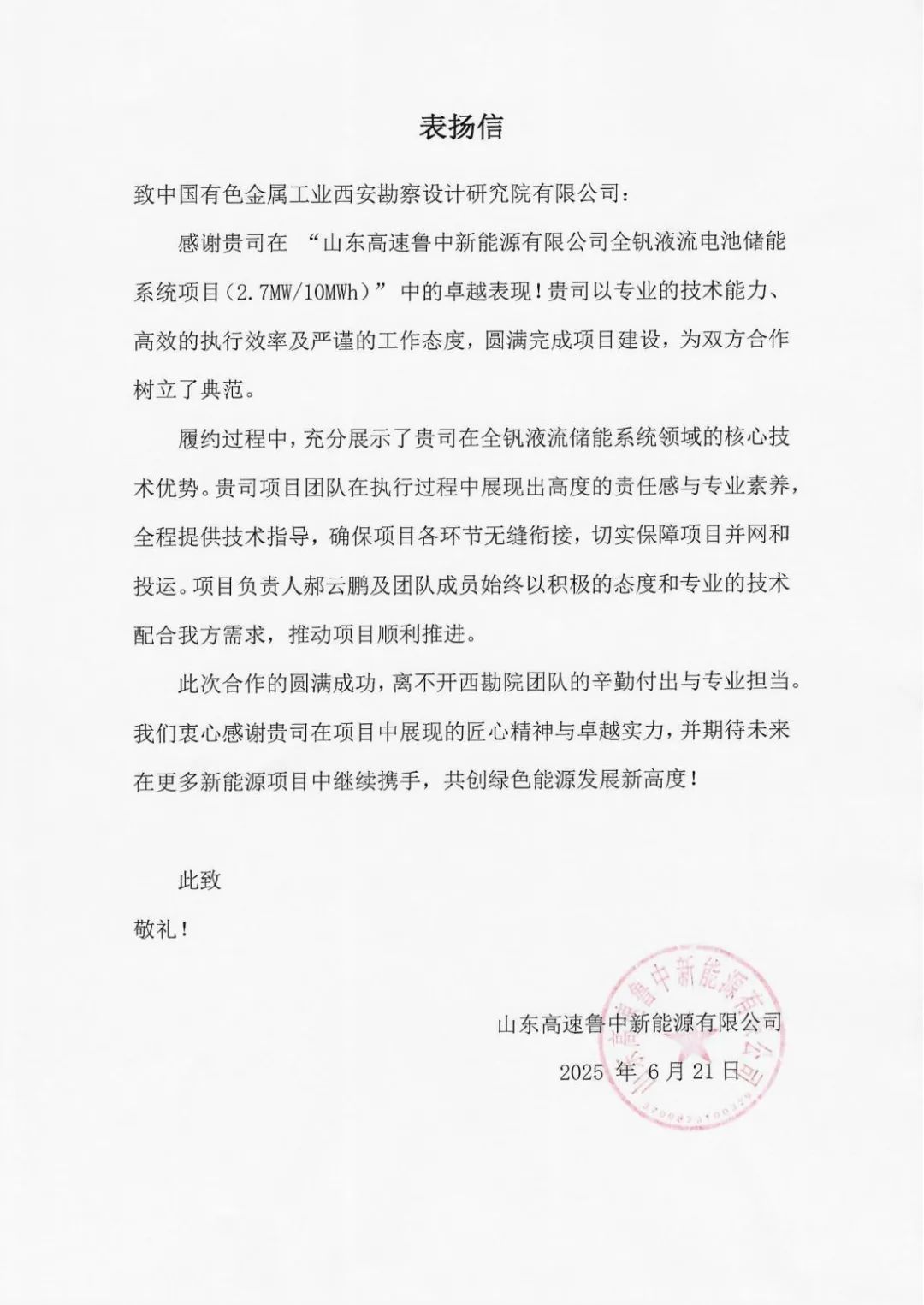在客戶發(fā)來(lái)的表?yè)P(yáng)信中,山東高速魯中新能源有限公司對(duì)公司專業(yè)技術(shù)能力、高效執(zhí)行力、嚴(yán)謹(jǐn)工作態(tài)度以及圓滿完成項(xiàng)目建設(shè)給予了高度贊揚(yáng)。信中特別指出,公司在全釩液流儲(chǔ)能系統(tǒng)領(lǐng)域展現(xiàn)了核心技術(shù)優(yōu)勢(shì),項(xiàng)目負(fù)責(zé)人郝云鵬及其團(tuán)隊(duì)成員以高度的責(zé)任感和專業(yè)素養(yǎng),全程提供可靠技術(shù)指導(dǎo),確保了項(xiàng)目各環(huán)節(jié)無(wú)縫銜接,有效保障了項(xiàng)目的順利并網(wǎng)和投運(yùn)??蛻羝诖磥?lái)與公司在更多新能源項(xiàng)目中深化合作,共同推動(dòng)綠色能源發(fā)展邁向新高度。