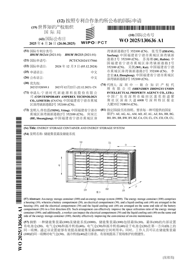 中國儲(chǔ)能網(wǎng)訊:證券之星消息,根據(jù)企查查數(shù)據(jù)顯示寧德時(shí)代(300750)公布了一項(xiàng)國際專利申請(qǐng),專利名為“儲(chǔ)能集裝箱及儲(chǔ)能系統(tǒng)”,專利申請(qǐng)?zhí)枮镻CT/CN2024/137066,國際公布日為2025年6月26日。
