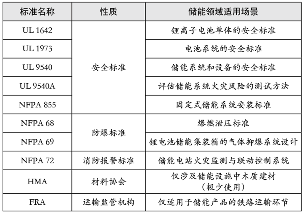 美國(guó)對(duì)進(jìn)口儲(chǔ)能產(chǎn)品的標(biāo)準(zhǔn)主要包括UL 1642、UL 1973、UL 9540、UL 9540A、NFPA 69、NFPA 72、NFPA 855、HMA、FRA等,具體標(biāo)準(zhǔn)內(nèi)容見(jiàn)表1。