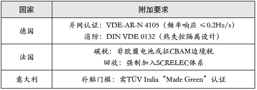 此外,歐洲部分國(guó)家對(duì)儲(chǔ)能標(biāo)準(zhǔn)有各自不同的附加要求,具體見(jiàn)表3。