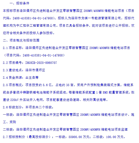 中國儲能網(wǎng)訊:7月7日,洛陽市龍祺一號能源管理有限公司發(fā)布洛陽偃師區(qū)先進(jìn)制造業(yè)開發(fā)區(qū)零碳智慧園區(qū)200MW/400MWh儲能電站項(xiàng)目招標(biāo)公告。項(xiàng)目位于河南省洛陽市偃師市,一標(biāo)段招EPC總承包,最高投標(biāo)限價55900萬元,折合單價1.398元/Wh,二標(biāo)段招監(jiān)理。