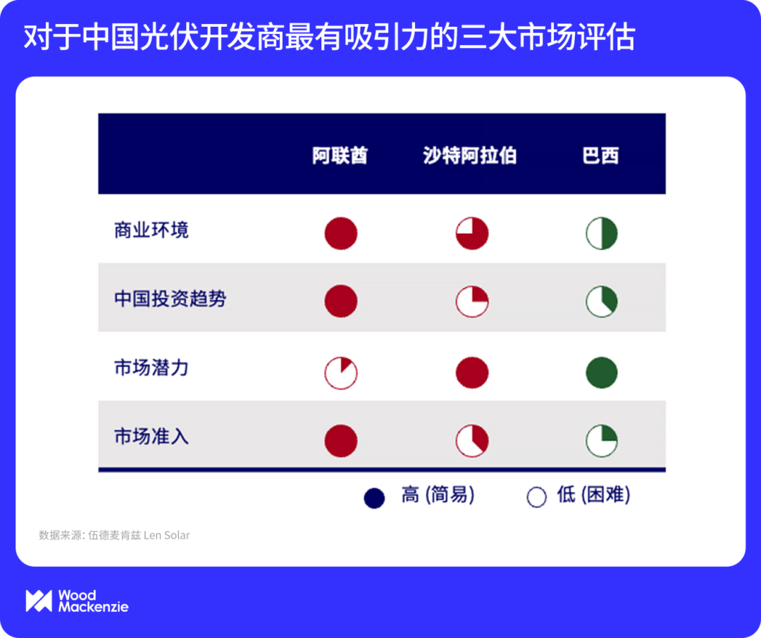 伍德麥肯茲基于商業(yè)環(huán)境、投資慣性、市場(chǎng)潛力和準(zhǔn)入難度進(jìn)行市場(chǎng)吸引力評(píng)估,發(fā)現(xiàn)排名前三的阿聯(lián)酋、沙特、巴西市場(chǎng)具有共同特點(diǎn):政策協(xié)同度較高、電力需求高增長(zhǎng)與準(zhǔn)入壁壘較低。