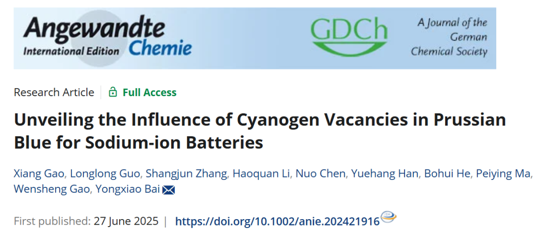 中國(guó)儲(chǔ)能網(wǎng)訊:近日,蘭州大學(xué)材料與能源學(xué)院拜永孝教授團(tuán)隊(duì)開發(fā)出了一種陰離子絡(luò)合制備鈉離子電池正極材料的方法。通過具有不同氰基空位的普魯士藍(lán)正極材料的可控合成、結(jié)構(gòu)與性能分析來揭示普魯士藍(lán)中陰離子空位的作用機(jī)制。該方法拓展了鈉離子電池高穩(wěn)定性普魯士藍(lán)正極材料合成的新途徑,為該類正極材料的工程化應(yīng)用奠定了基礎(chǔ)。相關(guān)成果以“Unveiling the Influence of Cyanogen Vacancies in Prussian Blue for Sodium-Ion Batteries”為題于2025年6月27日被國(guó)際著名期刊《Angewandte Chemie International Edition》發(fā)表。