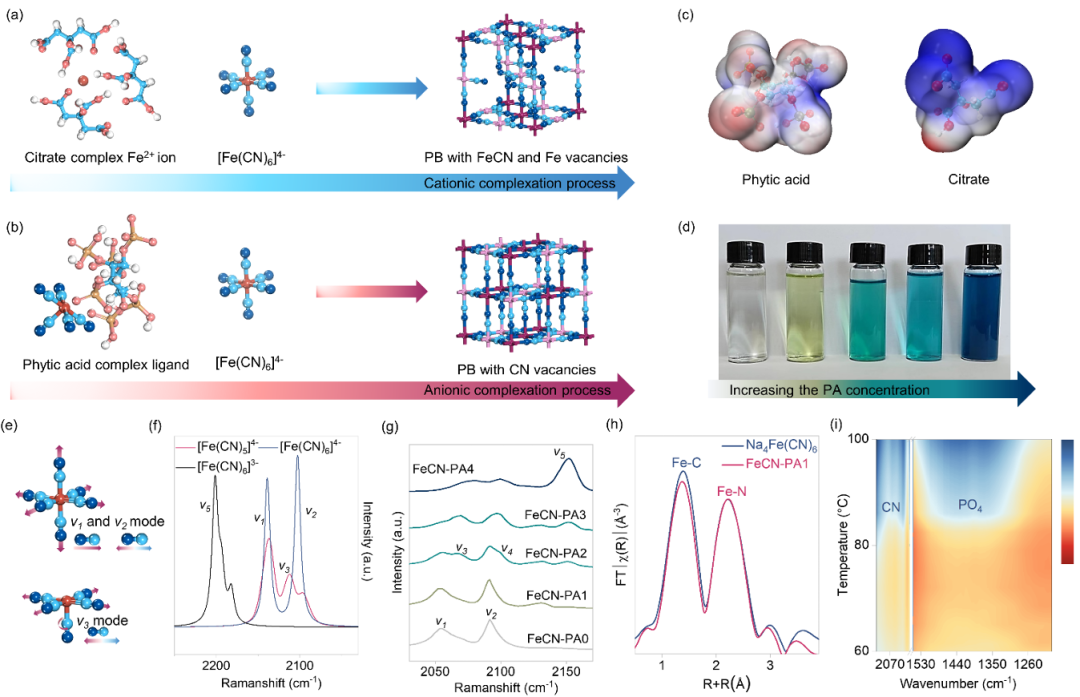 隨著可持續(xù)新能源的不斷發(fā)展,開發(fā)先進(jìn)的電化學(xué)儲(chǔ)能器件對(duì)于可再生能源有效集成到智能電網(wǎng)中至關(guān)重要。鈉離子電池以其鈉資源豐富、成本低、安全性高等特點(diǎn),被認(rèn)為是最有前途的大規(guī)模電網(wǎng)應(yīng)用儲(chǔ)能系統(tǒng)之一。普魯士藍(lán)(PB)因其高理論容量、低成本及開放框架結(jié)構(gòu),被視為鈉離子電池的理想正極材料。然而,傳統(tǒng)共沉淀法合成的普魯士藍(lán)存在大量[Fe(CN)?]空位,導(dǎo)致其較差的循環(huán)穩(wěn)定性,難以滿足低成本儲(chǔ)能的需求。目前廣泛采用的陽(yáng)離子絡(luò)合劑策略可以有效提升普魯士藍(lán)的結(jié)晶度,但是仍然伴隨著較差的低自旋鐵穩(wěn)定性差的問題。有研究表明通過空位工程合理引入陰離子空位可提升穩(wěn)定性,然而由于陽(yáng)離子絡(luò)合劑無法實(shí)現(xiàn)對(duì)陰離子的結(jié)構(gòu)調(diào)控。因此,開發(fā)可控合成策略并揭示陰離子空位的作用機(jī)制,成為推動(dòng)普魯士藍(lán)材料應(yīng)用的關(guān)鍵。