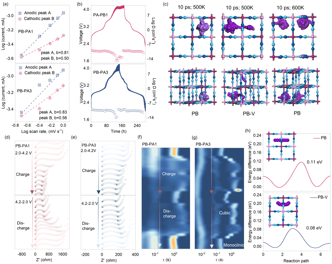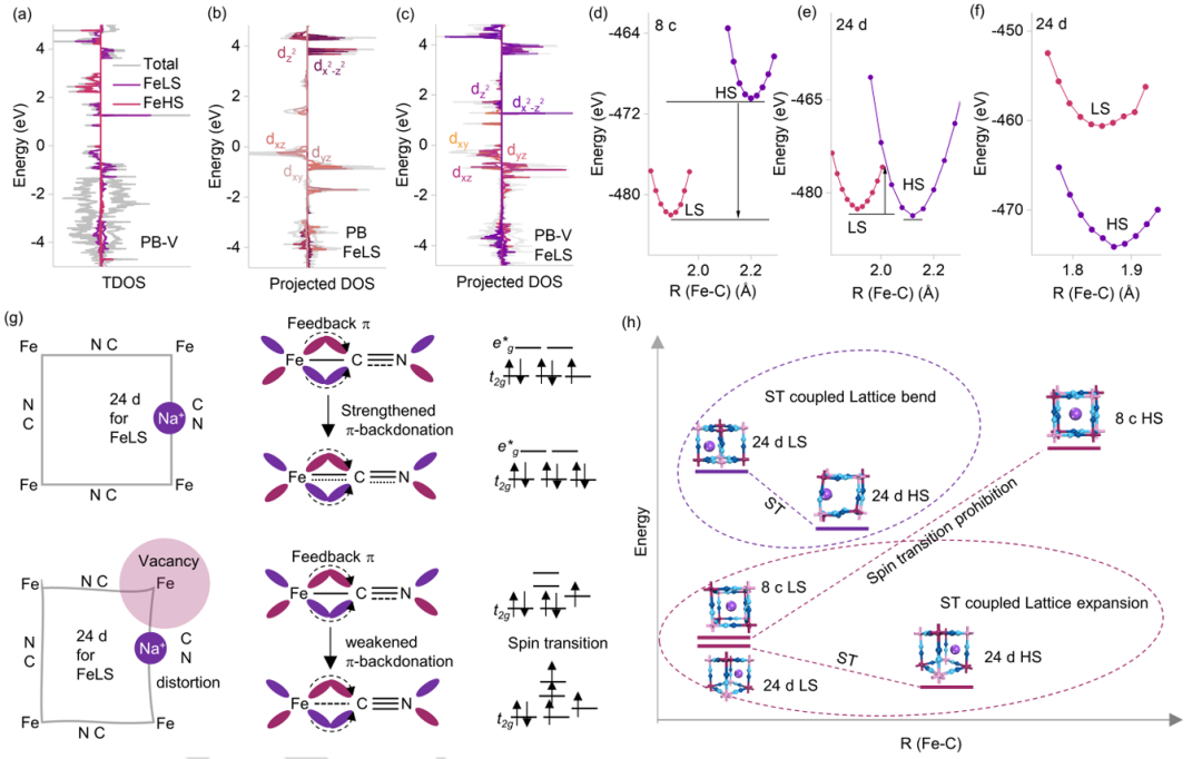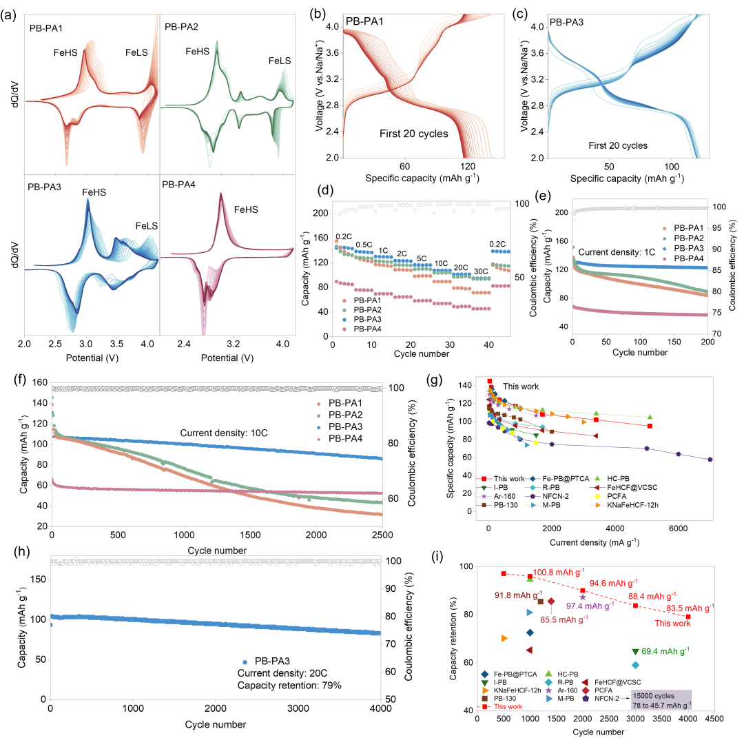 該研究首次提出利用競(jìng)爭(zhēng)配位作用絡(luò)合亞鐵氰根的陰離子絡(luò)合策略,實(shí)現(xiàn)CN空位的可控引入。(圖1)通過原位表征和理論計(jì)算闡明了氰根空位通過配體場(chǎng)對(duì)稱破缺策略將高對(duì)稱Oh群穩(wěn)定配體場(chǎng)轉(zhuǎn)變?yōu)榈蛯?duì)稱子群,為電子重新分布并發(fā)生自旋翻轉(zhuǎn)提供可能,在電化學(xué)性能上表現(xiàn)為不穩(wěn)定的低自旋鐵活性轉(zhuǎn)變?yōu)榉€(wěn)定的高自旋鐵,從而解決了普魯士藍(lán)中低自旋鐵不穩(wěn)定的難題。將上述過程總結(jié)并提出一種空位誘導(dǎo)下的“自旋轉(zhuǎn)變耦合晶格彎曲”機(jī)制(圖2)。并且在動(dòng)力學(xué)也證明空位引入可以改變晶體電子云分布并且降低鈉離子的擴(kuò)散能壘,從而提升電極材料的倍率性能,具有優(yōu)異的快充快放性能(圖3)。在20C大電流充放電下循環(huán)4000次容量保持率為79%,為迄今報(bào)道的最佳PB基鈉電陰極之一(圖4)。該研究不僅提供了精準(zhǔn)調(diào)控氰基空位的合成新范式,更通過“自旋轉(zhuǎn)變-晶格彎曲”機(jī)制破解了普魯士藍(lán)材料的長(zhǎng)循環(huán)穩(wěn)定性難題,為下一代鈉電正極材料開辟了新路徑。未來,該方法有望推動(dòng)低成本儲(chǔ)能技術(shù)邁向?qū)嵱没凸こ袒瘧?yīng)用。