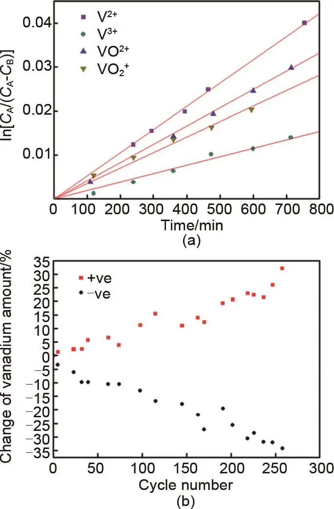 圖1 (a) ln [CA/(CA-CB)]與t的關(guān)系圖;(b) 長期充放電循環(huán)中釩離子總量的變化