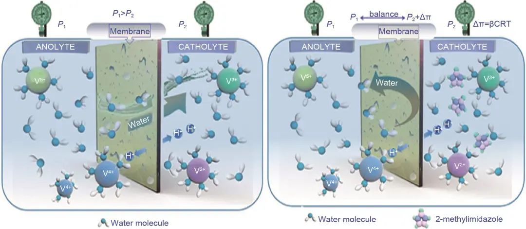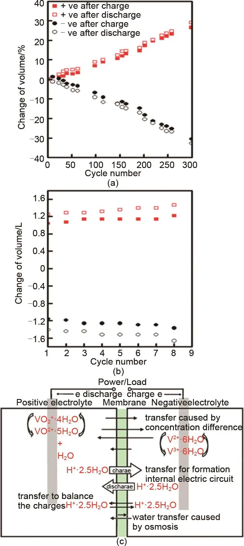 水遷移所導(dǎo)致的體積失衡加劇了電解液的濃度失衡,其增加了一個半電池中的電解液濃度,同時稀釋了另一個半電池中的電解液,擴大了濃度差,降低了釩離子的利用率,并可能導(dǎo)致釩離子在高濃度半電池中的沉淀。在充放電循環(huán)中,由于產(chǎn)生了釩離子和水分子的持續(xù)交叉,工程上需要定期重新平衡電解液,以恢復(fù)全釩液流電池的容量,從而增加了運維成本。