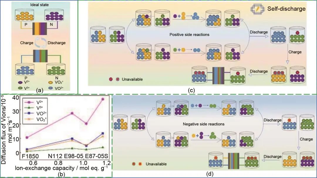 圖3 (a) 理想條件下的充放電示意圖;(b) 不同釩離子通過膜的擴散通量;(c) V2+/V3+和 (d) VO2+/VO2+在實際循環(huán)過程中的自放電反應(yīng)示意圖