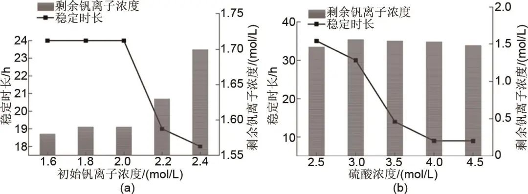 圖4 (a) 釩離子濃度對穩(wěn)定性的影響;(b) 硫酸濃度對穩(wěn)定性的影響