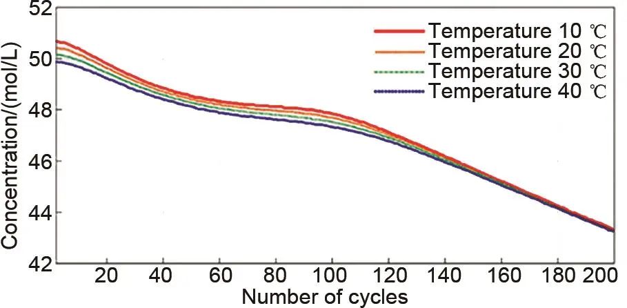 全釩液流電池中存在著釩離子的氧化還原反應(yīng),工作過程中涉及熱反應(yīng),由此產(chǎn)生的溫度變化不僅會影響電解液本身的穩(wěn)定性,還會對電極上的一系列電化學(xué)反應(yīng)產(chǎn)生影響。隨溫度升高,電池材料腐蝕、副反應(yīng)及釩沉淀產(chǎn)生的速度加快,進一步導(dǎo)致了容量的衰減。