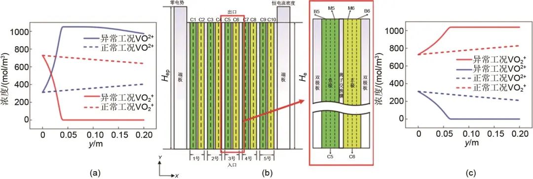 圖7 (a) 放電與 (c) 充電工況下正極VO2+/VO2+濃度沿C6分布,(b) 全釩液流電池電堆模型圖