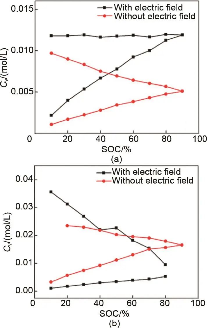 圖8 有無電場作用下釩離子的輸運行為:(a) 各SOC下,釩離子從VO2+/VO2+側(cè)遷移到Fe3+/Fe2+側(cè);(b) 各SOC下,釩離子從V3+/V2+側(cè)擴散到Fe2+/Fe3+側(cè)