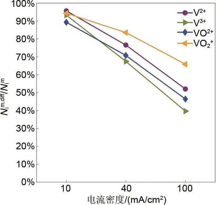 Cecchetti等人根據(jù)三種不同電流密度(10 mA/cm2、40 mA/cm2、100 mA/cm2)下的測試結(jié)果,對全釩液流電池運行的一維物理模型進行了校準,得出結(jié)論:①較高的工作電流密度增加了充放電循環(huán)的速度,可以減少電池自放電和釩交叉引起的電解液不平衡;②在低電流密度下,各價態(tài)釩離子的擴散在交叉通量中占比均高于90%,是釩通過膜的主要機制,而在高電流密度下,擴散和電遷移對釩通量的貢獻幾乎相等(圖9)。