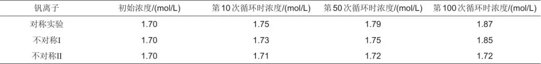 在全釩液流電池中,電能以化學(xué)能的形式存儲于電解液中。提高活性物質(zhì)的濃度,可以直接提高電池的能量密度與放電容量,但是活性物質(zhì)濃度較高時,電解液穩(wěn)定性下降易產(chǎn)生沉淀,反而降低電池容量。此外,電解液中釩離子總是由負極儲液罐跨膜滲透至正極儲液罐,因此通常采用提升負極滲透壓的方式來促進水分子向負極擴散,從而減小釩離子的遷移以抑制容量衰減問題。李君濤等[34]設(shè)置了不對稱濃度實驗(表2),在充放電循環(huán)中,降低負極電解液的釩離子濃度并提高其硫酸含量,增加負極液滲透壓,減少釩離子和水分子的跨膜擴散,最終減少了電池容量的損失,對稱實驗、不對稱Ⅰ和不對稱Ⅱ的容量衰減率分別為0.8、0.66、0.52。