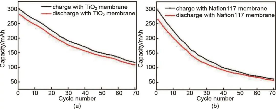 圖11 添加2-甲基咪唑?qū)?(a) TiO2和 (b) Nafion117膜VRFB容量衰減的影響