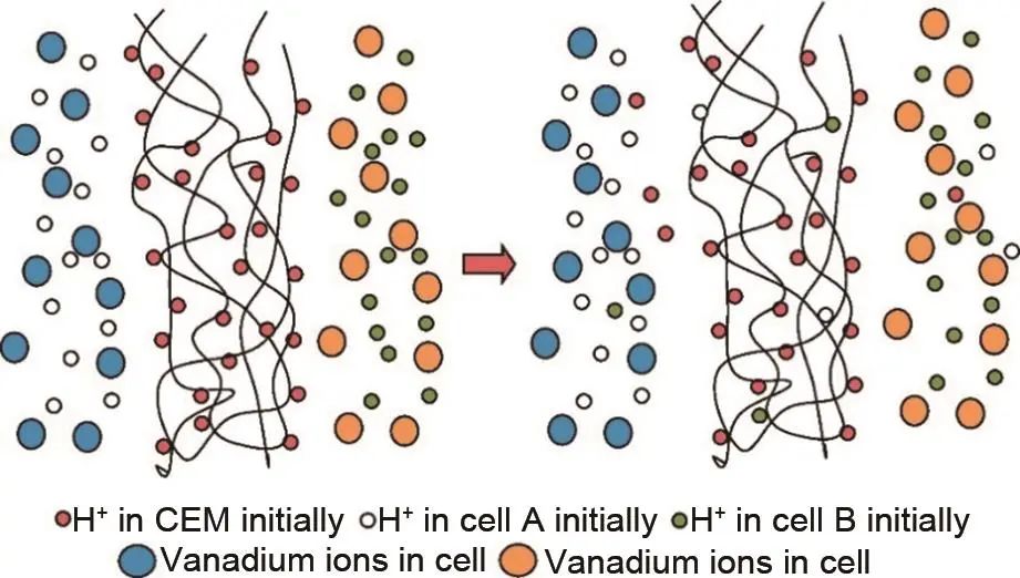 全釩液流電池在運行時,正、負半電池中的釩離子因跨膜滲透而失衡,這種現(xiàn)象的出現(xiàn)對長期循環(huán)后電池容量的下降有重要影響。后續(xù),水分子遷移、自放電、析氣反應(yīng)、釩析出等其他因素也會導(dǎo)致電池容量的損失[7-10]。此外,工作條件如工作溫度、電解液流量、電流密度、活性物質(zhì)濃度等因素也會影響電池運行容量的衰減。