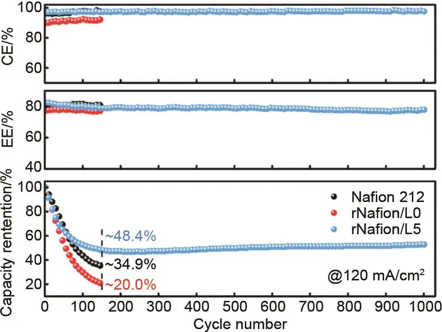 根據(jù)膜上基團的不同,隔膜主要有陽離子交換膜、陰離子交換膜、兩性離子交換膜、非離子多孔膜等,陽離子交換膜的作用原理如圖12所示。目前全釩液流電池中普遍使用的是杜邦公司生產(chǎn)的Nafion系列膜,該膜為陽離子交換膜,其本身具有優(yōu)秀的離子導(dǎo)電性與氧化穩(wěn)定性,但同時也存在著離子選擇性不足,釩滲透率高的問題。因此,通常通過引入抗釩離子層或與無機材料雜化來降低其釩離子透過率。Ye等人采用溶液混合和澆鑄法制備了Nafion/木質(zhì)素復(fù)合膜,通過木質(zhì)素擴大質(zhì)子傳導(dǎo)通道來促進質(zhì)子的傳輸,并降低釩離子的滲透率,從而提高了釩離子的選擇性。如圖13所示,在120 mA/cm2時,與目前商業(yè)化應(yīng)用的Nafion 212膜相比,使用該復(fù)合膜的全釩液流電池在原有效率不變的情況下提升了容量保持率,在150次循環(huán)時仍保有48.4%。
