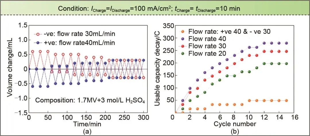 充放電末期流量的增加可以為半電池提供更多的反應(yīng)物,促進氧化還原反應(yīng),降低濃度過電位,增大系統(tǒng)容量。然而,只針對濃差極化的流量調(diào)節(jié)往往忽略了變流量對于釩離子遷移的影響,對于長期循環(huán)后的容量保持是不利的。對于衰減抑制方面來說,在降低濃差極化的同時還應(yīng)結(jié)合流量對釩離子遷移的影響,使電池獲得最大容量的同時降低其容量衰減率。