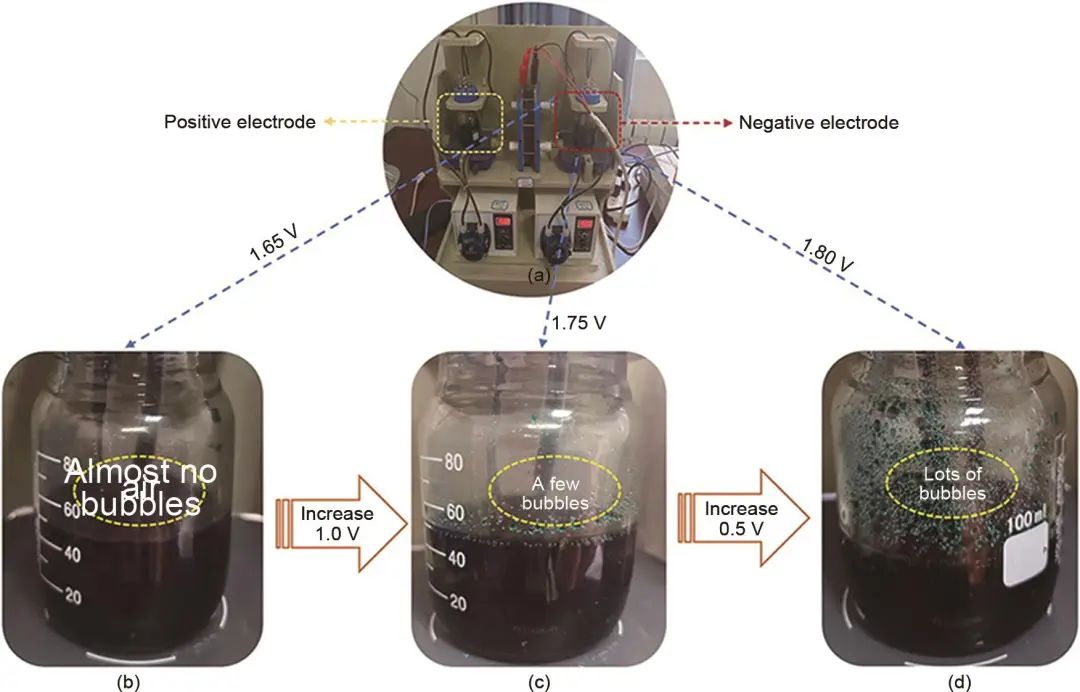 圖15 截止電壓對析氣反應(yīng)的影響 (a) 單體電池;(b) 1.65 V;(c) 1.75 V;(d) 1.80 V