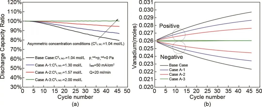 不對稱濃度抑制了釩離子和水分子的遷移,對于容量的長久保持是有利的。然而活性物質(zhì)濃度的不對稱導(dǎo)致了正負極電解液未能全部反應(yīng),降低了釩離子的利用率,實際上減少了釩電池的總?cè)萘俊?/span>