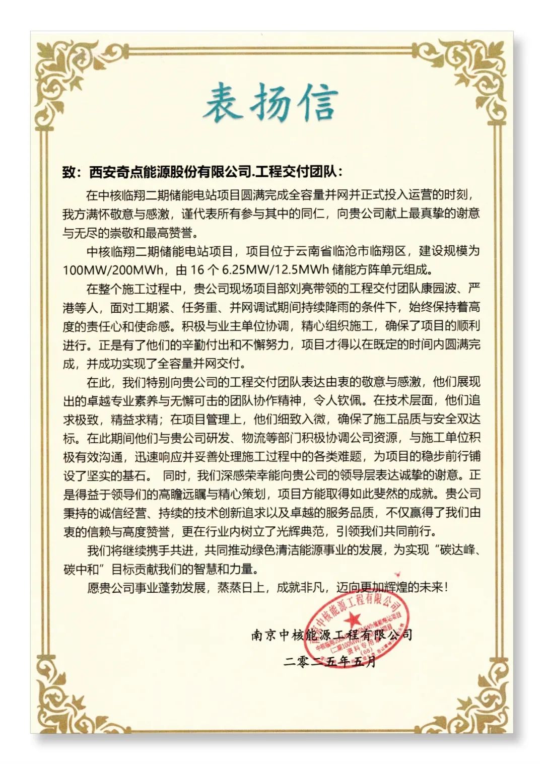 項(xiàng)目并網(wǎng)后,客戶特別致以感謝信,字字句句皆是肯定:”面對(duì)工期緊、任務(wù)重、并網(wǎng)調(diào)試期間持續(xù)降雨的條件下,始終保持著高度的責(zé)任心和使命感。積極與業(yè)主單位協(xié)調(diào),精心組織施工,確保了項(xiàng)目的順利進(jìn)行?!边@封表揚(yáng)信,既是榮譽(yù)勛章,更是鞭策奇點(diǎn)能源不斷前行的動(dòng)力。
