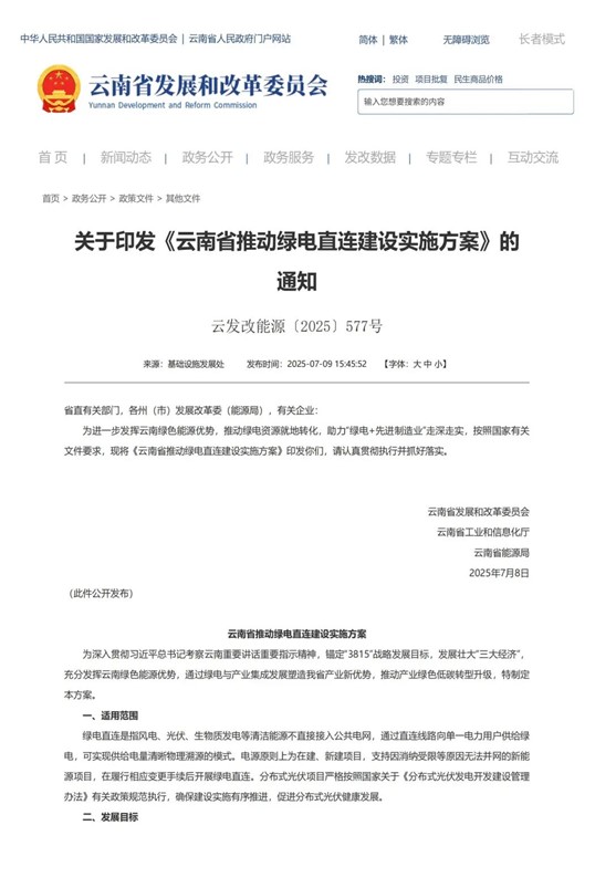 中國(guó)儲(chǔ)能網(wǎng)訊:2025年7月8日,云南省發(fā)改委、工信廳、能源局聯(lián)合推出《綠電直連建設(shè)實(shí)施方案》,為新能源消費(fèi)模式按下“加速鍵”。這項(xiàng)被戲稱為“新能源界外賣直達(dá)服務(wù)”的創(chuàng)新政策,將風(fēng)電、光伏發(fā)電的“新鮮電能”通過專屬“電力高速公路”直送工廠,徹底告別傳統(tǒng)電網(wǎng)的“中間商”。