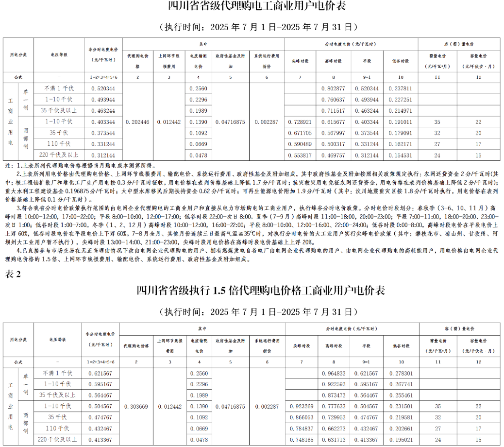 四川省7月省級(jí)代理購(gòu)電、1.5倍代理購(gòu)電工商業(yè)用戶電價(jià)表如下: