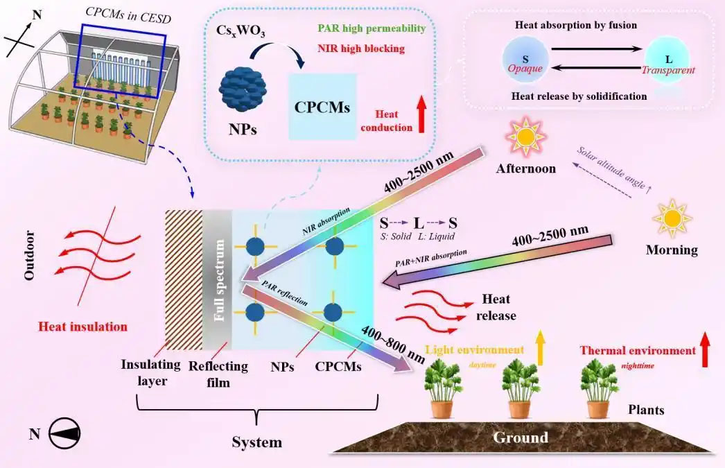 該研究以銫鎢青銅納米粒子復合六水氯化鈣作為光譜分離介質,設計了一種位于北墻的立柱式相變儲能裝置。太陽光在經(jīng)過該裝置后被光熱解耦,紅外光利用復合相變材料進行儲能,光合輻射有效波段的太陽光經(jīng)過裝置反射后,能促進作物光合作用。