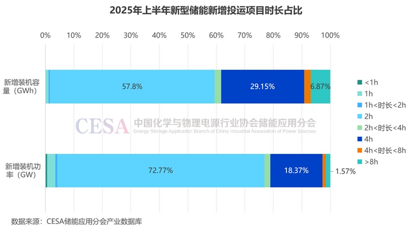 其中,2h儲(chǔ)能新增裝機(jī)15.77GW/31.56GWh,規(guī)模占比72.77%(功率)/57.80%(容量)。