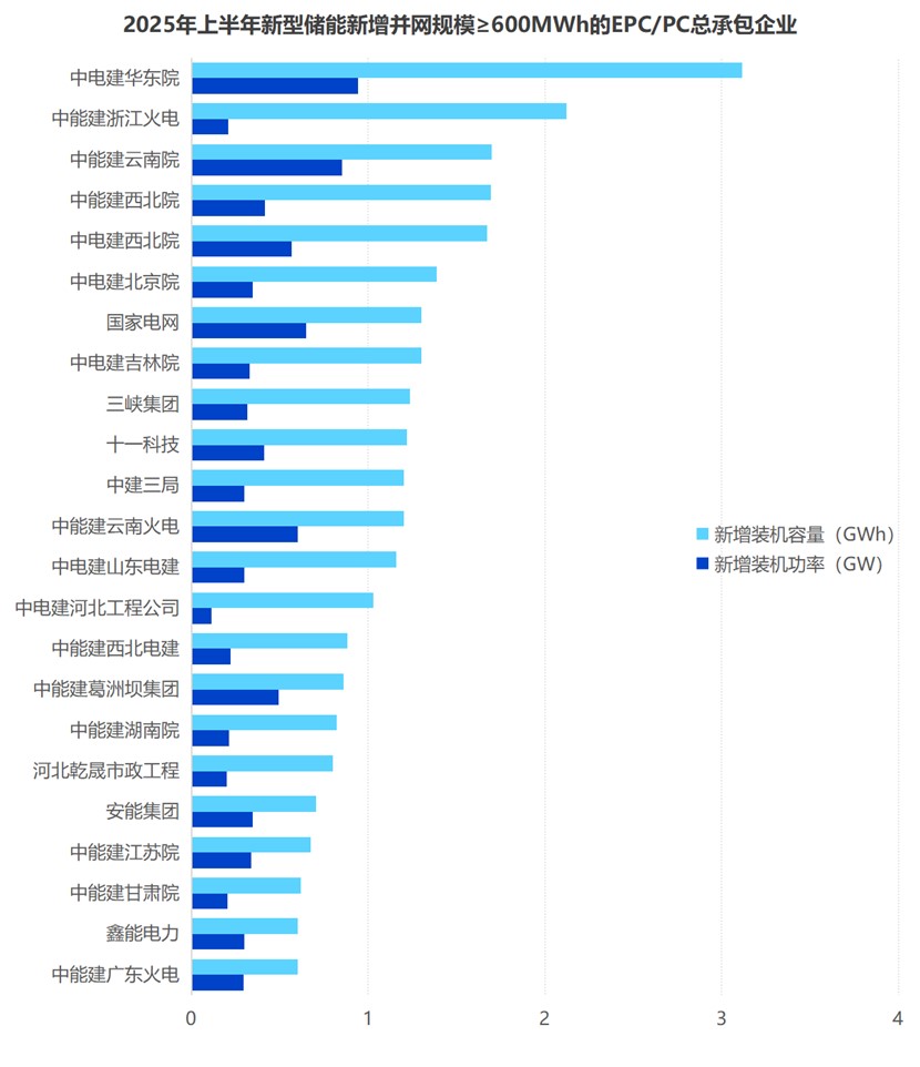 據(jù)CESA儲(chǔ)能應(yīng)用分會(huì)產(chǎn)業(yè)數(shù)據(jù)庫(kù)不完全統(tǒng)計(jì),2025年上半年新增投運(yùn)的項(xiàng)目中,中電建和中能建EPC/PC總承包新增裝機(jī)容量占比達(dá)53.8%,超過(guò)全國(guó)的一半。
