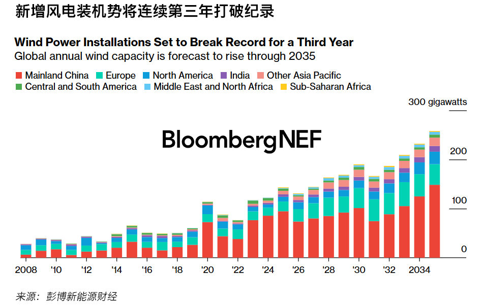 根據(jù)彭博新能源財經(jīng)的預(yù)測,2025年全球風電新增裝機容量或?qū)⒃鲩L17%,達到創(chuàng)紀錄的143GW。中國大陸占增長的三分之二,并將推動亞太地區(qū)風電單一年份新增裝機容量首次突破100GW。到2030年,累計風電裝機容量將翻一番至2TW,到2035年逼近3TW大關(guān)。