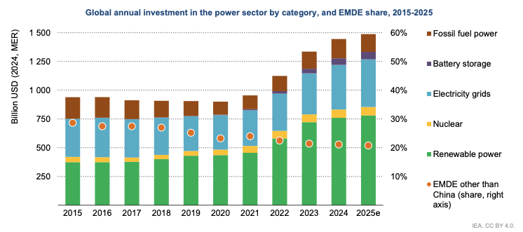 2015年-2025年全球電力投資規(guī)模及新興市場占比 來源:IEA
